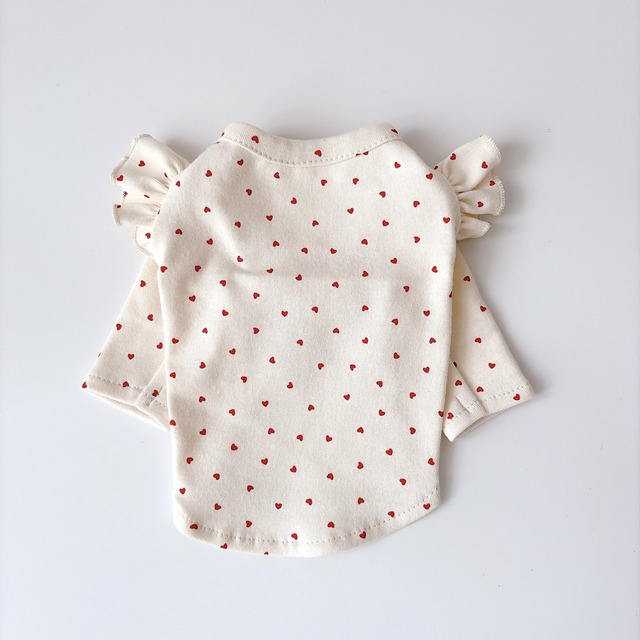 ハートのプリントが散りばめられたアイレットカットソー。とても柔らかくよく伸びる素材です。 袖口はゴム入りです。 (トルソーのサイズ:首周り23cm 着丈23cm 胴回り34cm XS着用。) ★生地の伸縮性★ よく伸びます ★色★ オフホワイト ★素材★ コットン100 ★サイズ★ XXS:首周り20cm 着丈20cm 胴回り30cm 袖(腹側)8.5㎝ XS:首周り24cm 着丈23cm 胴周り36cm 袖(腹側)10㎝ S:首周り27cm 着丈26cm 胴周り42cm 袖(腹側)11.5㎝ お洋服の仕上がりサイズを記載しています。 ★★サイズ調節は+500円にて承ります★★ 最大サイズは、Sサイズの各箇所+10cmまでです。ご希望の方は、サイズ調節を選択し、 備考欄にヌードサイズまたは出来上がりサイズを記載してください。 ※ヌードサイズか出来上りサイズかを必ずご記載ください