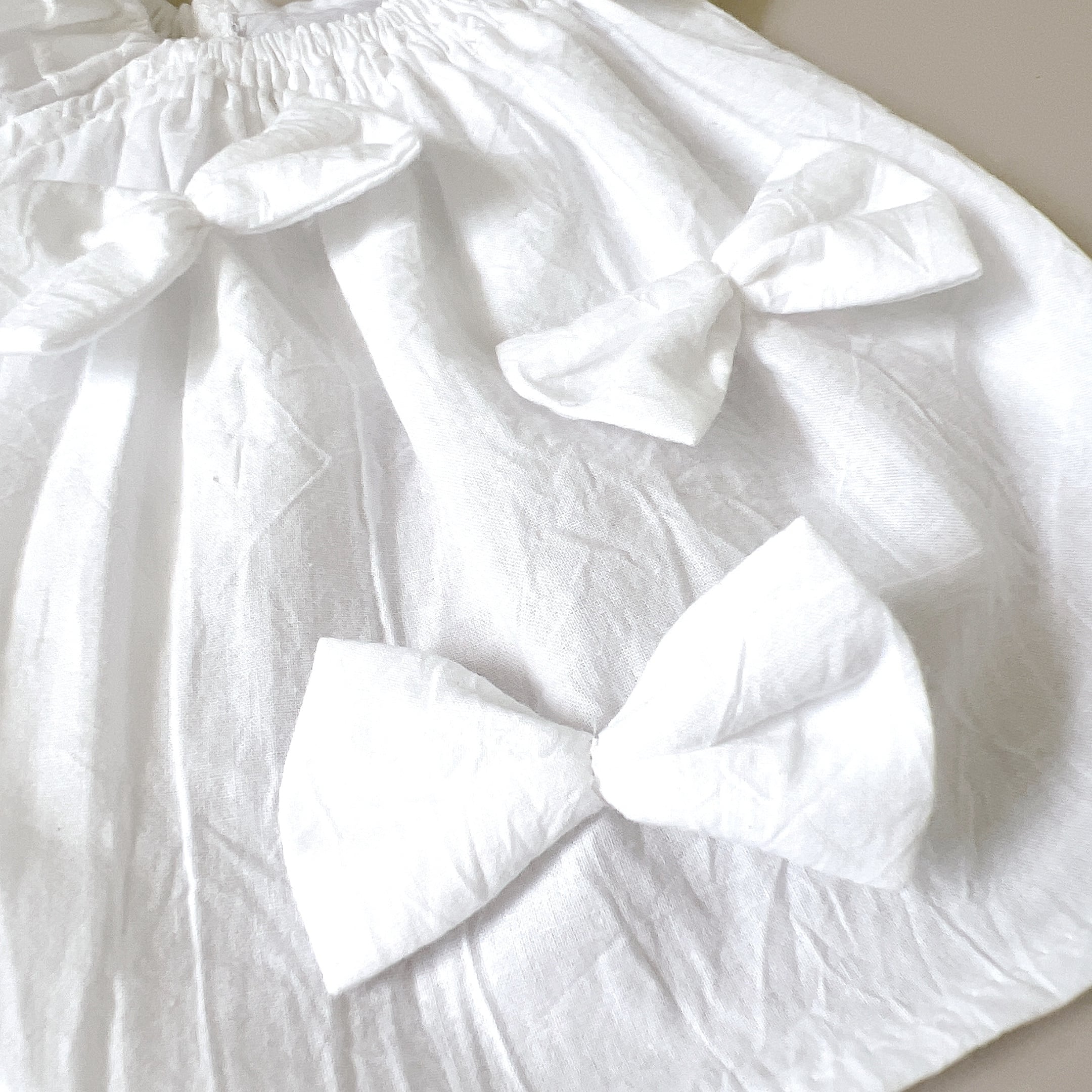 軽くてさらっとしたキャッチワッシャー加工のコットン生地。同素材の大きなリボンを散りばめました。袖のラッフルフリルと首元のシャーリングがベビードールのような見た目の一枚です。