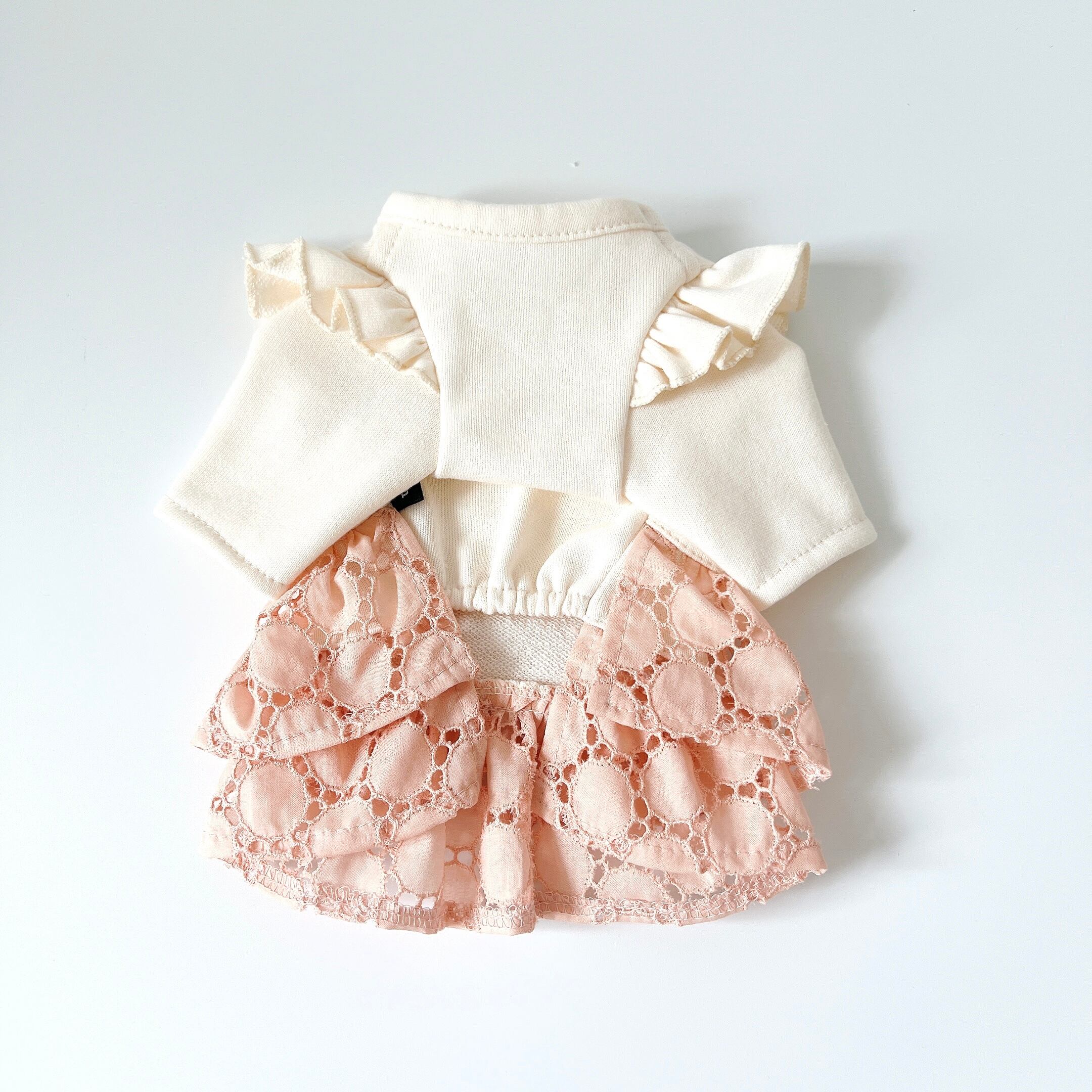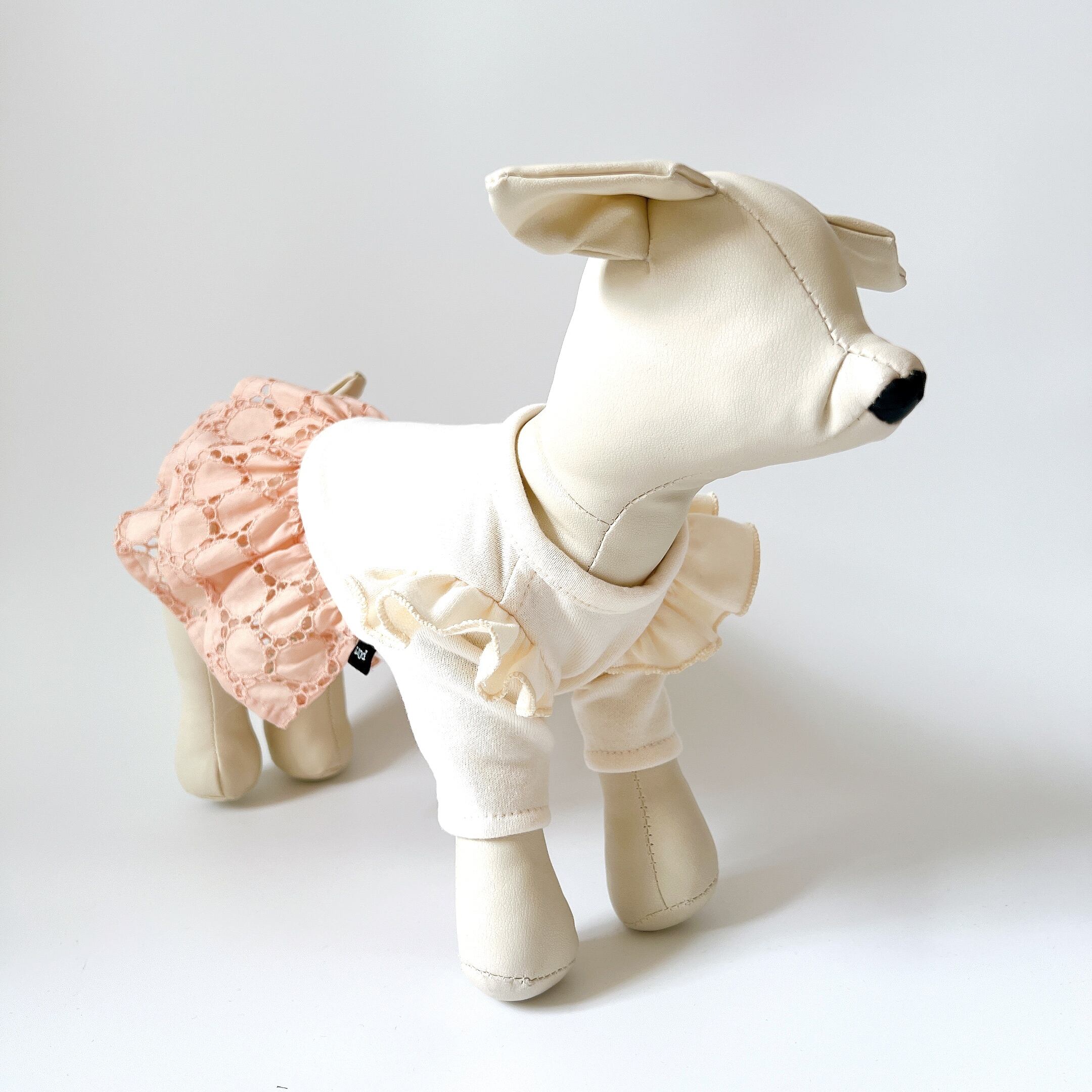 ミニ裏毛素材のフリルカットソーとオレンジピンクのサークルレースの切替ワンピース。