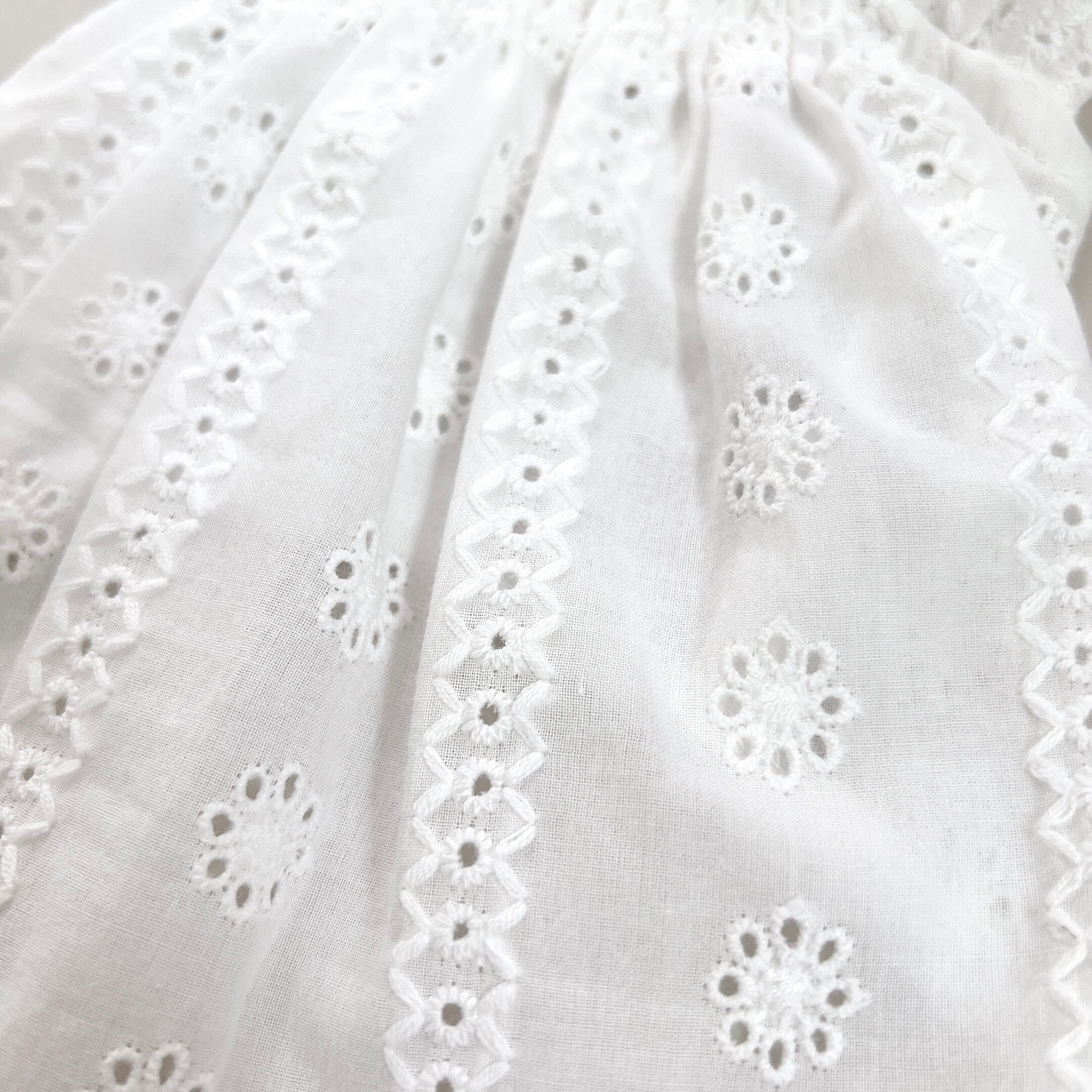 お花模様のアイレット刺繍。袖のラッフルフリルと首元のシャーリングがベビードールのような見た目の一枚です。柔らかく肌あたりの良いコットン生地。