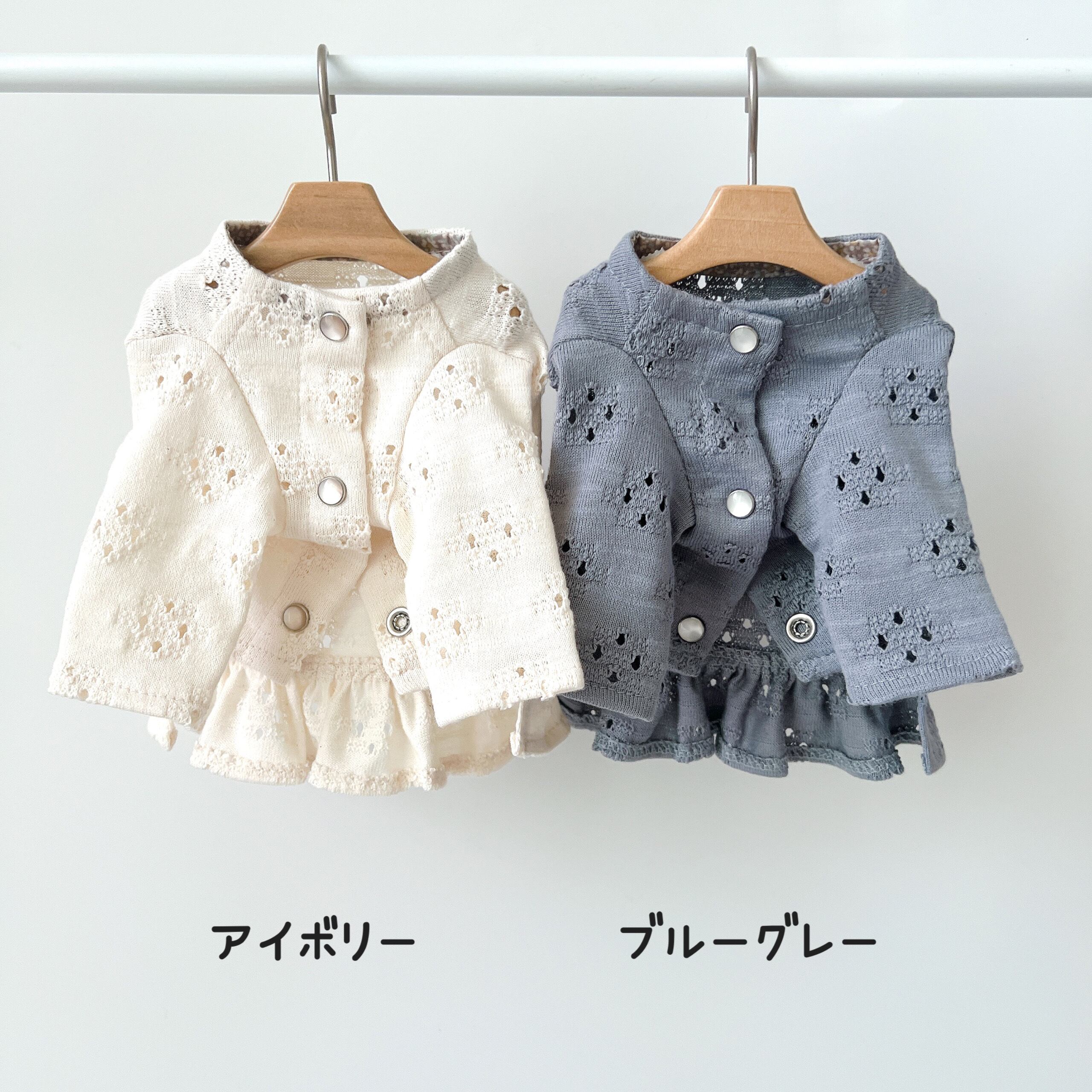 天竺ニットの透かし編みレースカーディガン。薄過ぎず柔らかな生地で通年着られます。レースと裾フリルがとっても女の子らしい一枚です。