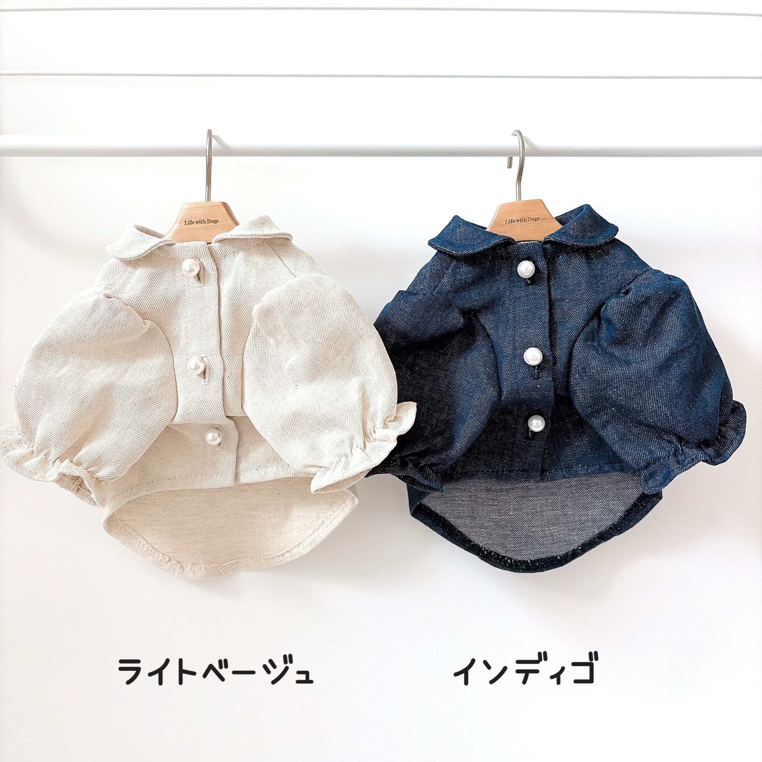 リネン混のライトなデニム生地のブラウス。リネンによる素朴な表情と軽さ、ワッシャー仕上げにより膨らみのある柔らかなデニム生地です。小さめの丸襟とパフスリーブがとっても可愛い一枚です。袖口はゴム入り。