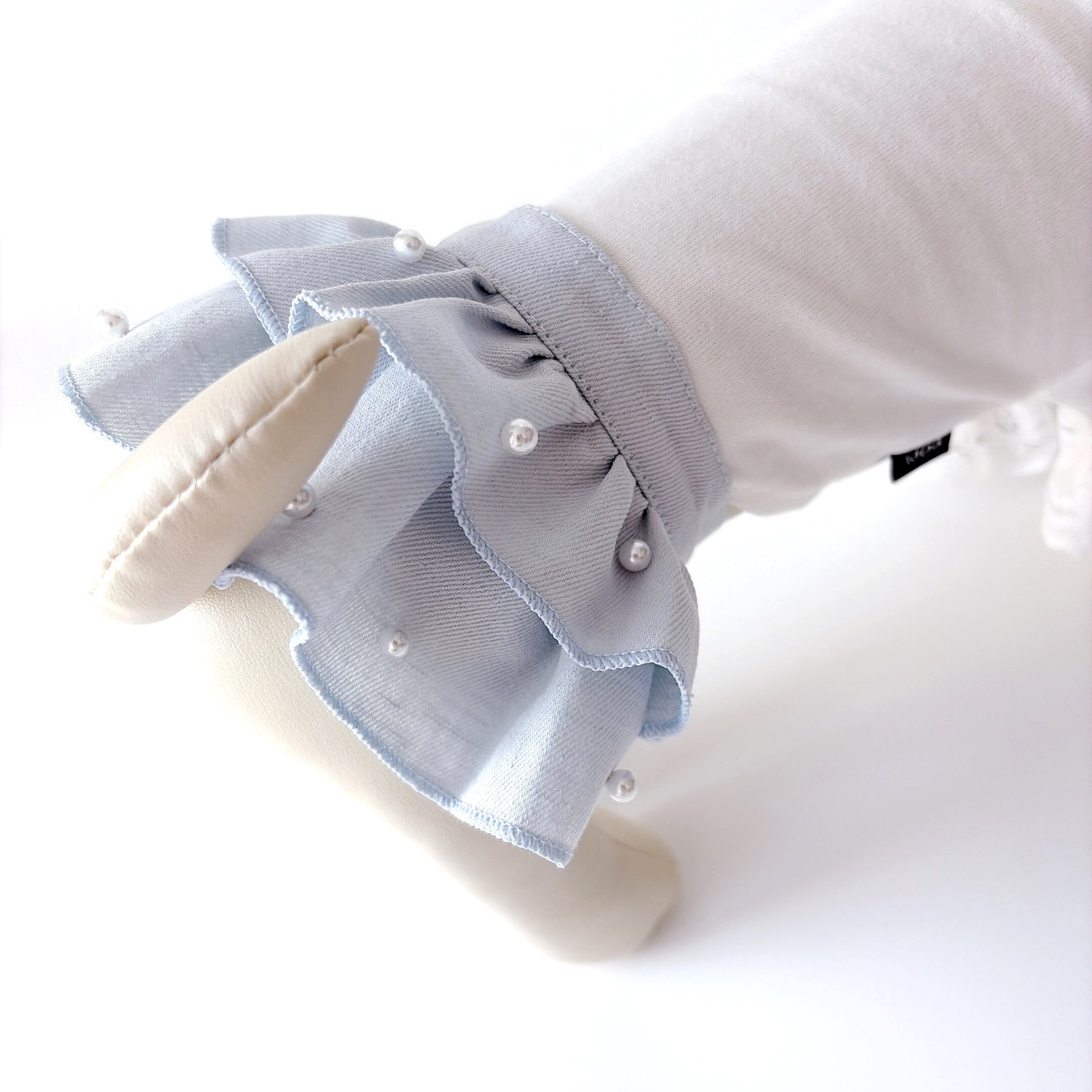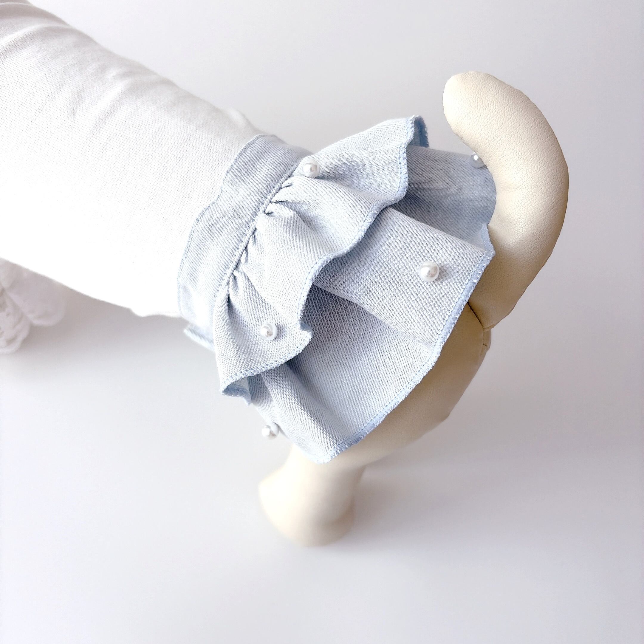 デニムフリルスカートにパールを散りばめました。