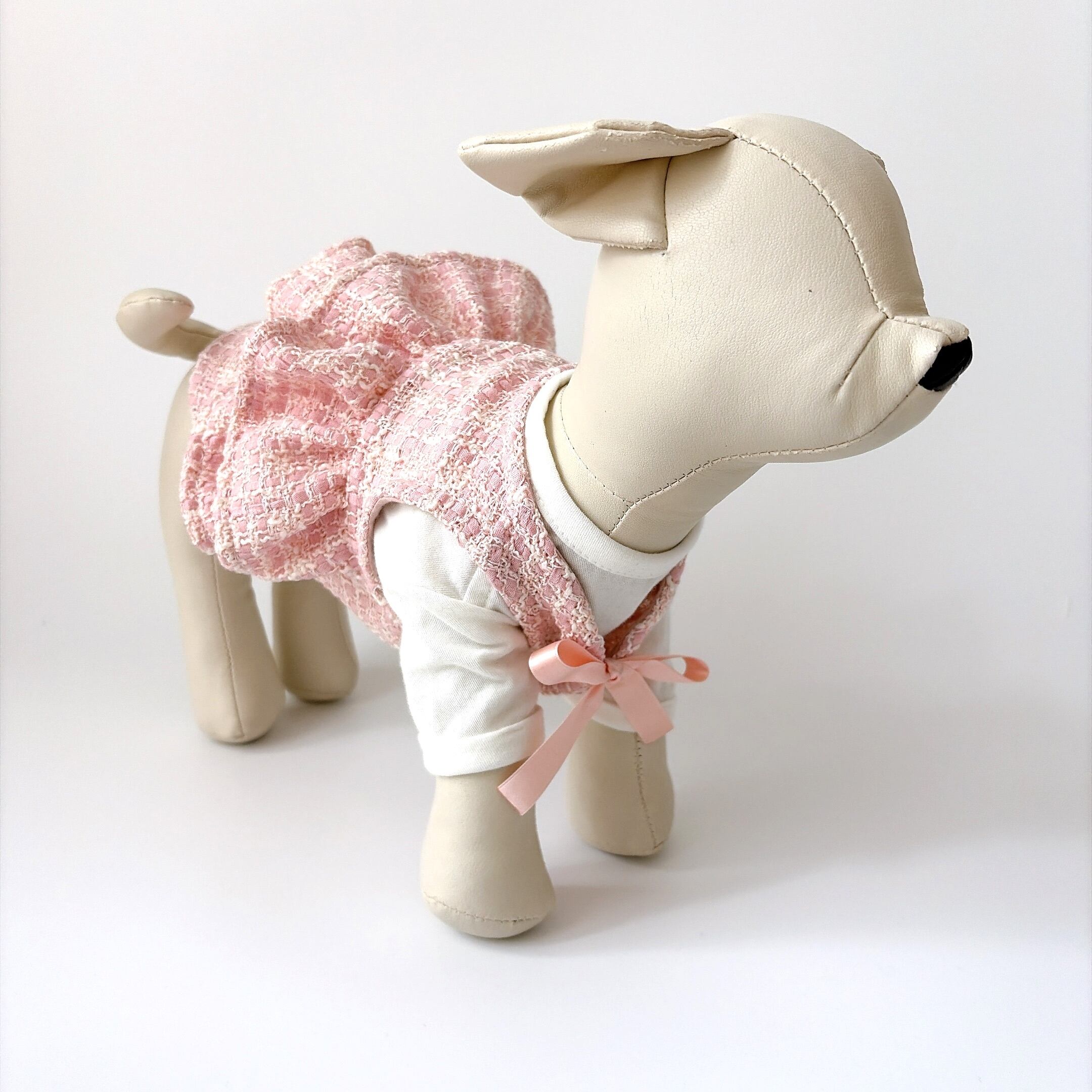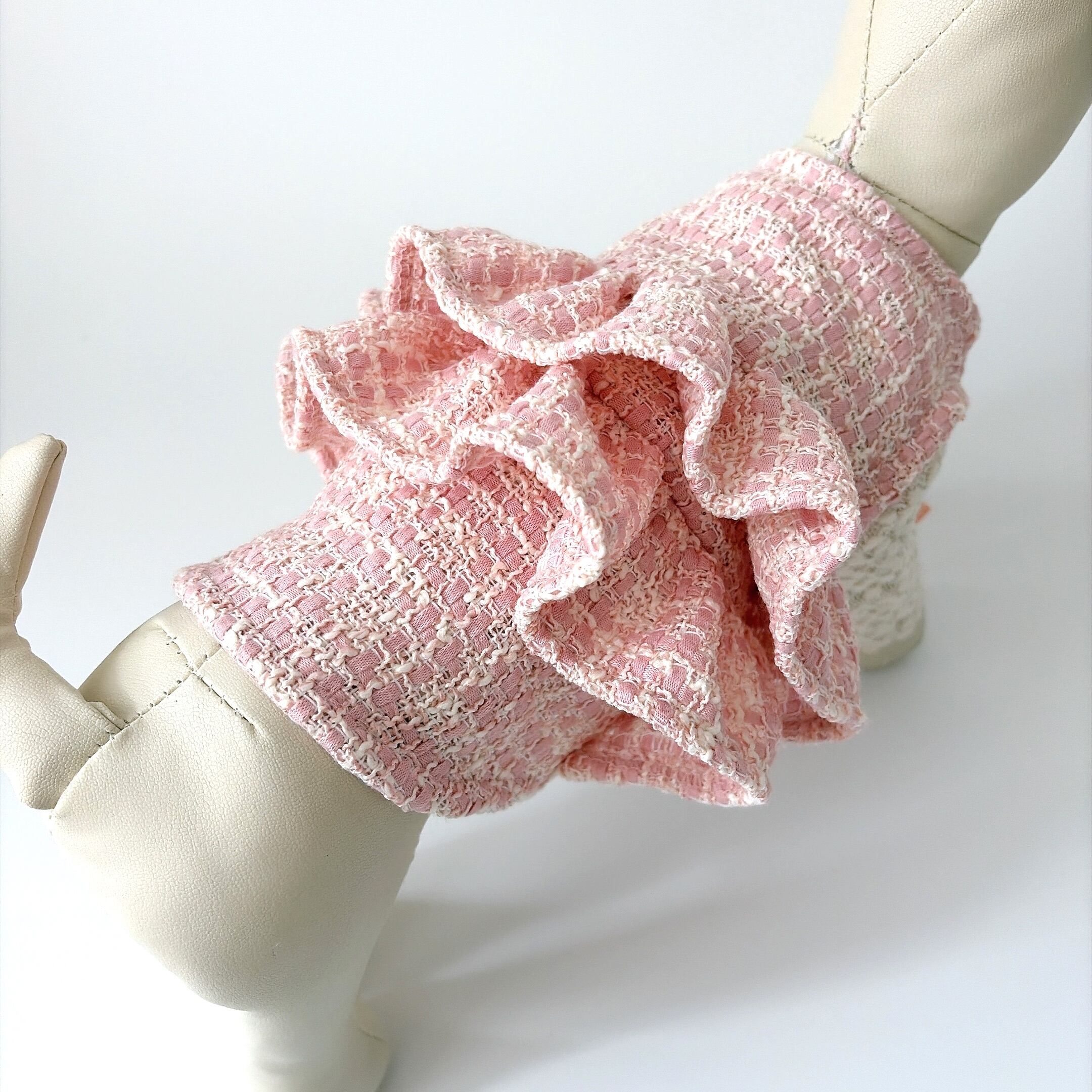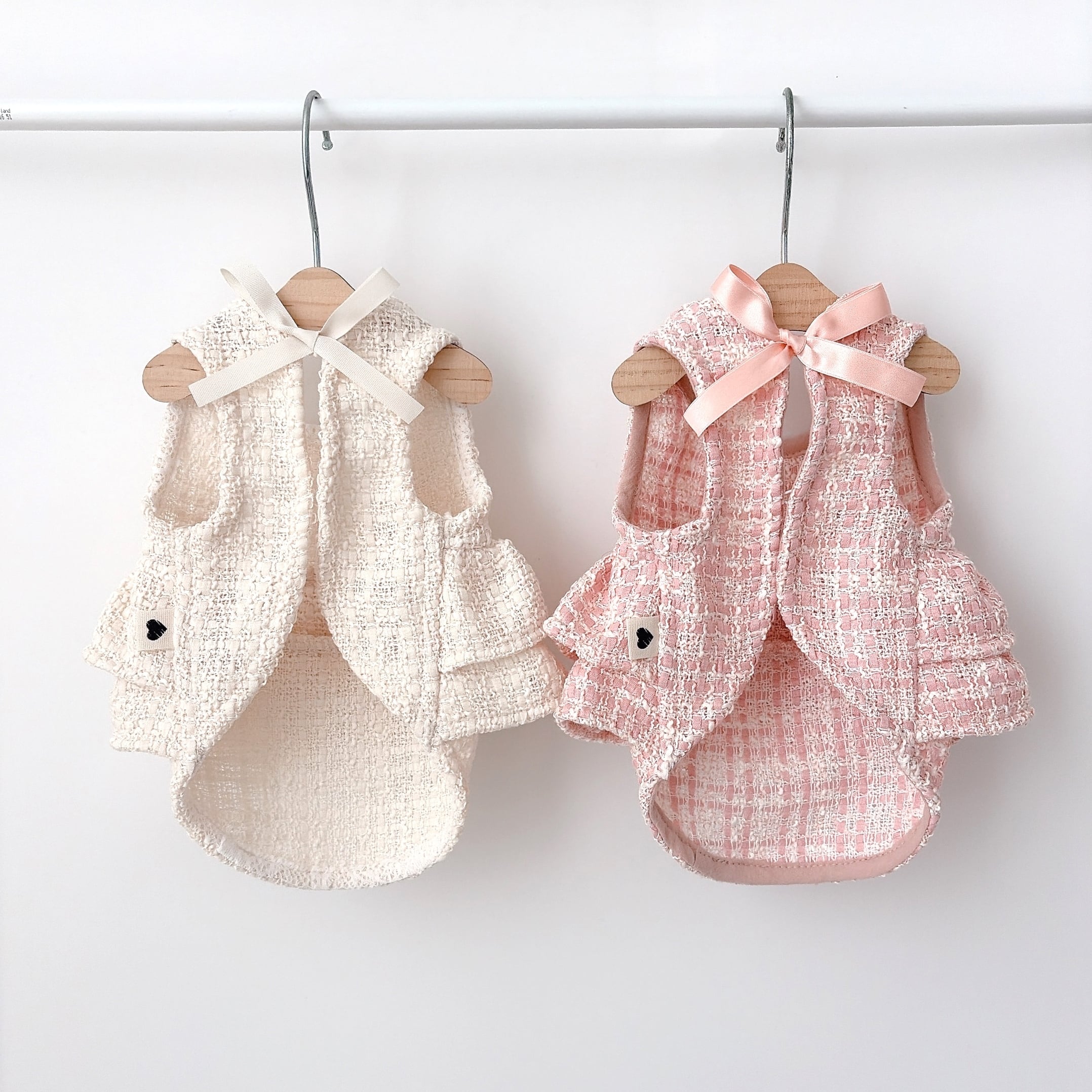 しっとりとした手触りで高級感のあるツイード生地のフリルベスト。胸元のリボンで前開きなので着せやすいです。