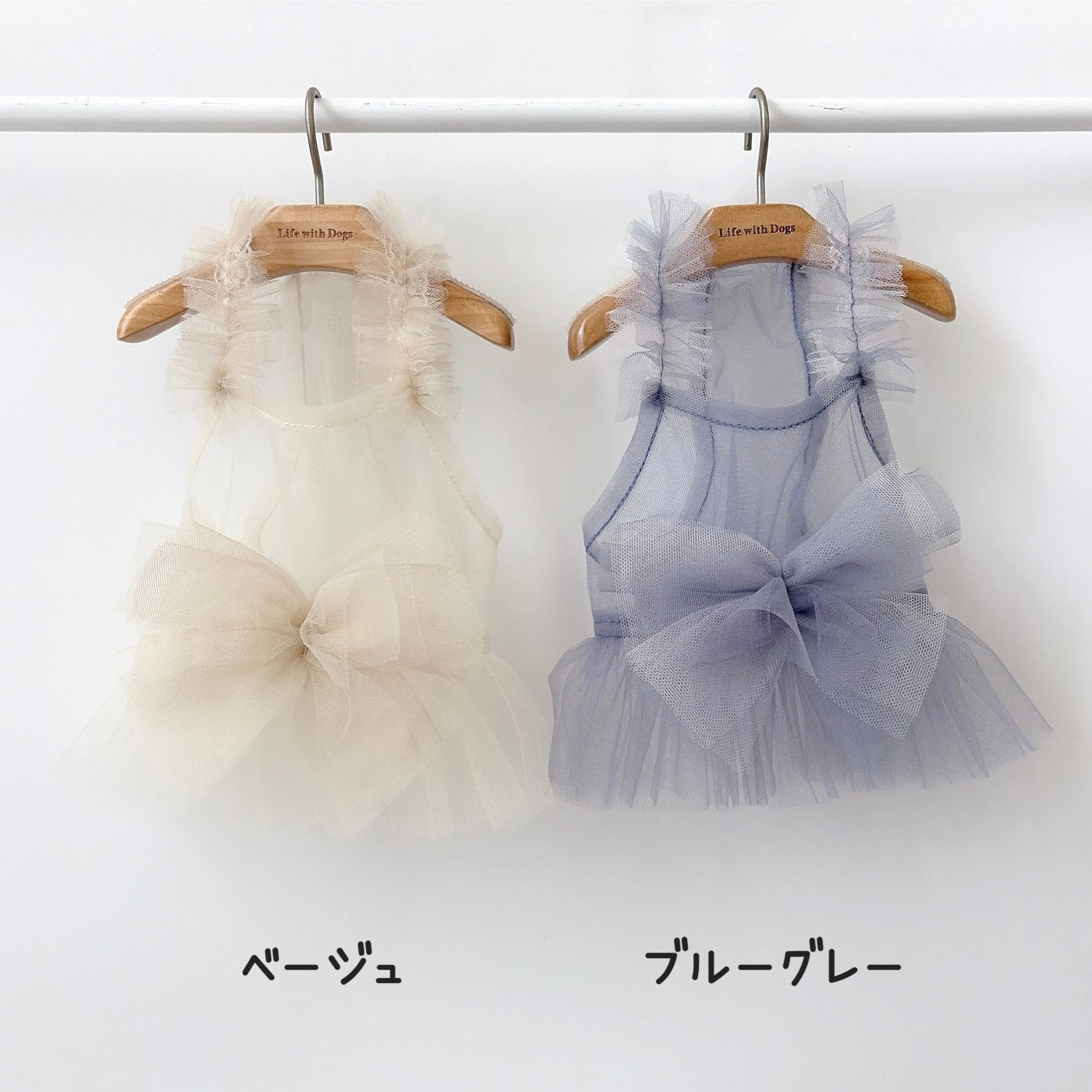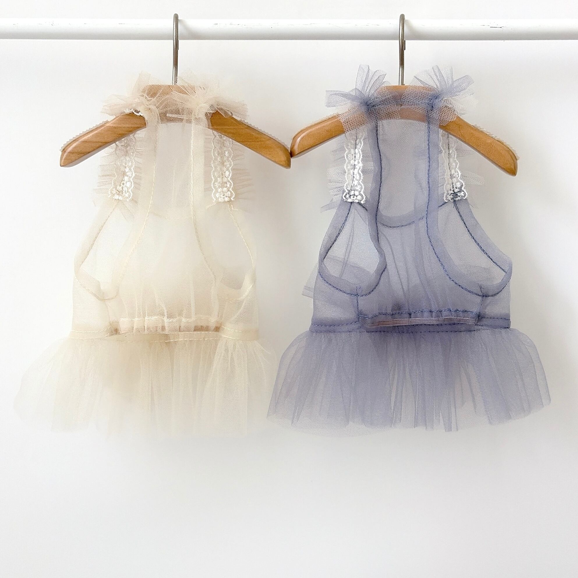共に2色のチュールを使用しグラデーション仕様になっています。チュールは2枚仕立て、前身頃の裾部分にゴムを入れて着せやすくしています。